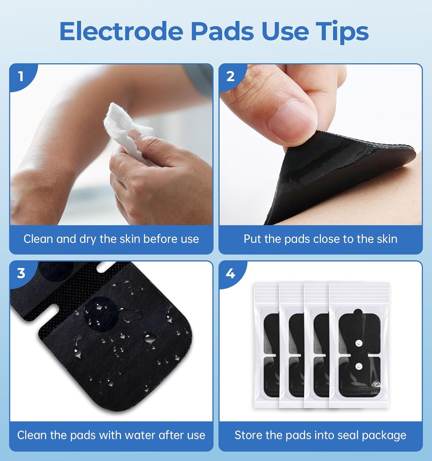 Секое пакување вклучува една електрода за повеќекратна употреба, направени од хипоалергенски хидрогел и самолеплив материјал сертифициран од класа 1. Уживајте во одлична спроводливост и адхезија за повеќекратна употреба, обезбедувајќи ефикасно олеснување кога ви е потребно.Со правилна употреба, тие можат да се користат повеќе од 50 пати. Исчистете ја кожата пред да ја нанесете електродата ,доколку кожата е мрсна и нечиста  , електродите нема да се залепат правилно. По употреба, чувајте ги електродите во нивното оригинално пакување.